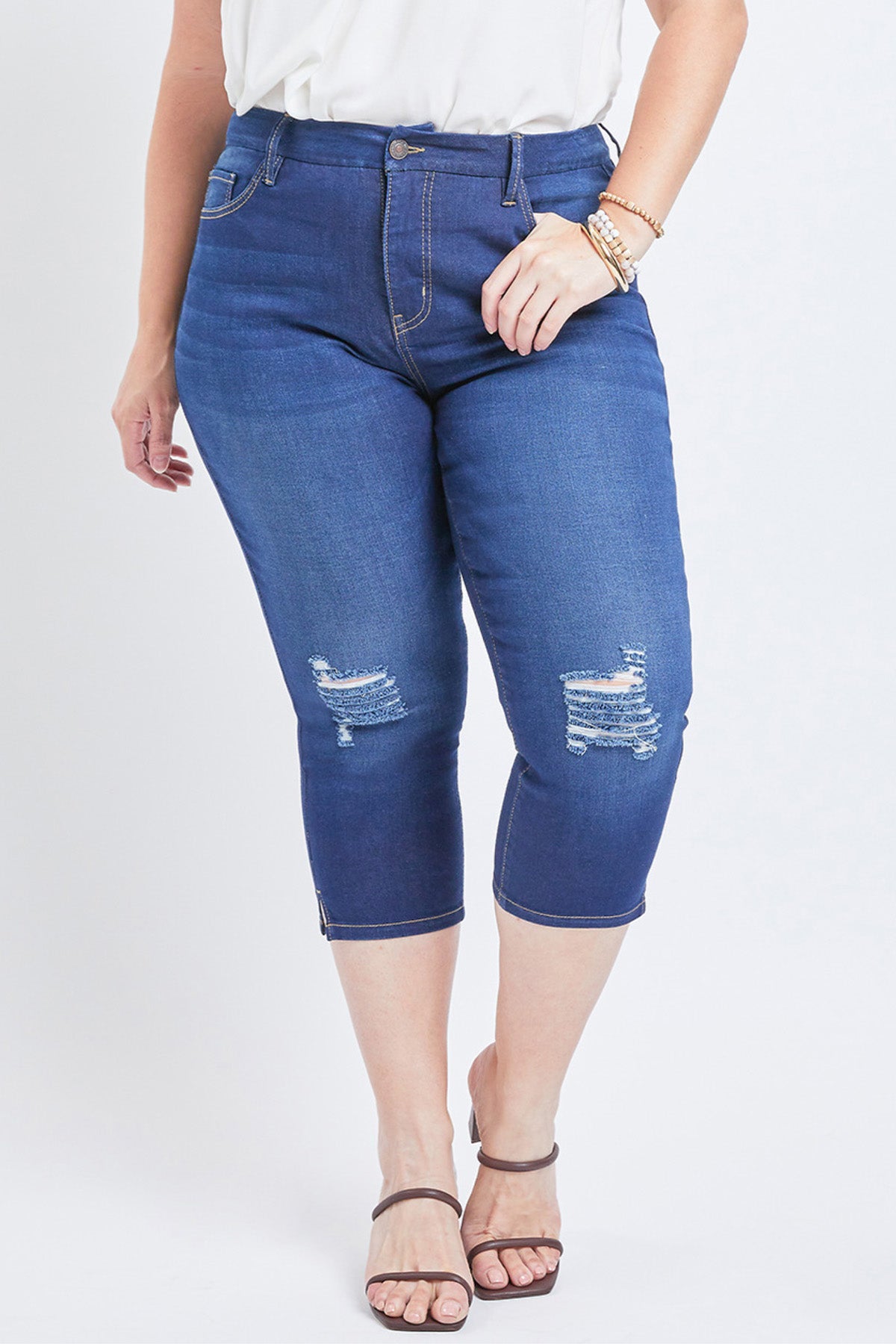 Casual and carefree, our Women Plus Size Curvy 1-Button High-Rise Side Slit Hem Capri will be one of your favorites when the temperatures rise. Designed with an ultra-high-rise and a curvy fit, these capris provide a slimming effect so you look and feel your best. Featuring tasteful destruction for a lived-in, weekend look and side-slit hems for easy movement. We love how you can dress these up or down: pair with a tee and flats for a casual look or wear a flirty blouse and heeled sandals for a dressier look.