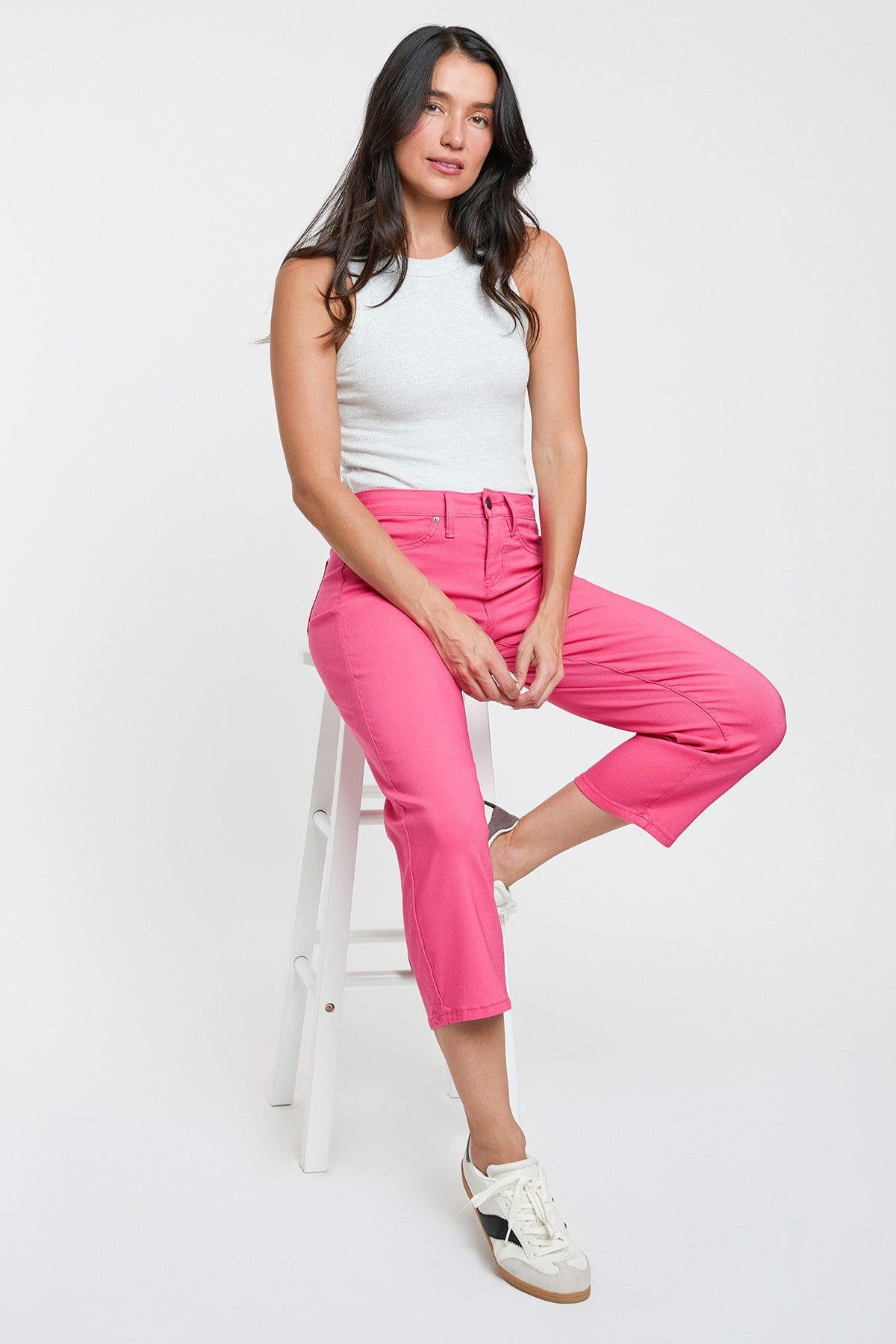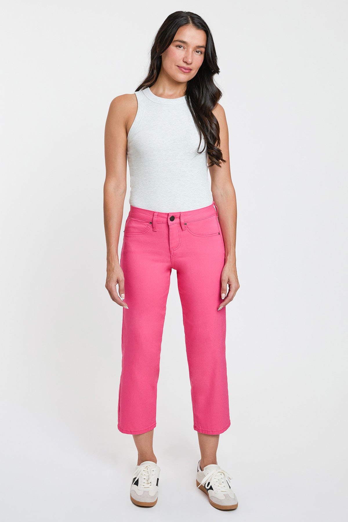 The perfect addition to your Spring wardrobe! Our Missy Mid-Rise Hyperstretch Wide Leg Cropped With Faux Front Pockets is not only super stretchy and flexible for all-day wear, but also lightweight and breathable for warmer days ahead! Featuring contouring technology, engineered to give you an incredible fit and hold while accentuating your curves. We've designed these in a cropped wide leg that hits in the middle of your calf. Available in gorgeous Spring colors, as well as neutrals, so you can mix and match with your current wardrobe. Pair with a floral blouse and heeled sandals for the ultimate Spring look, or wear them more casual with a front tucked tee and flats!