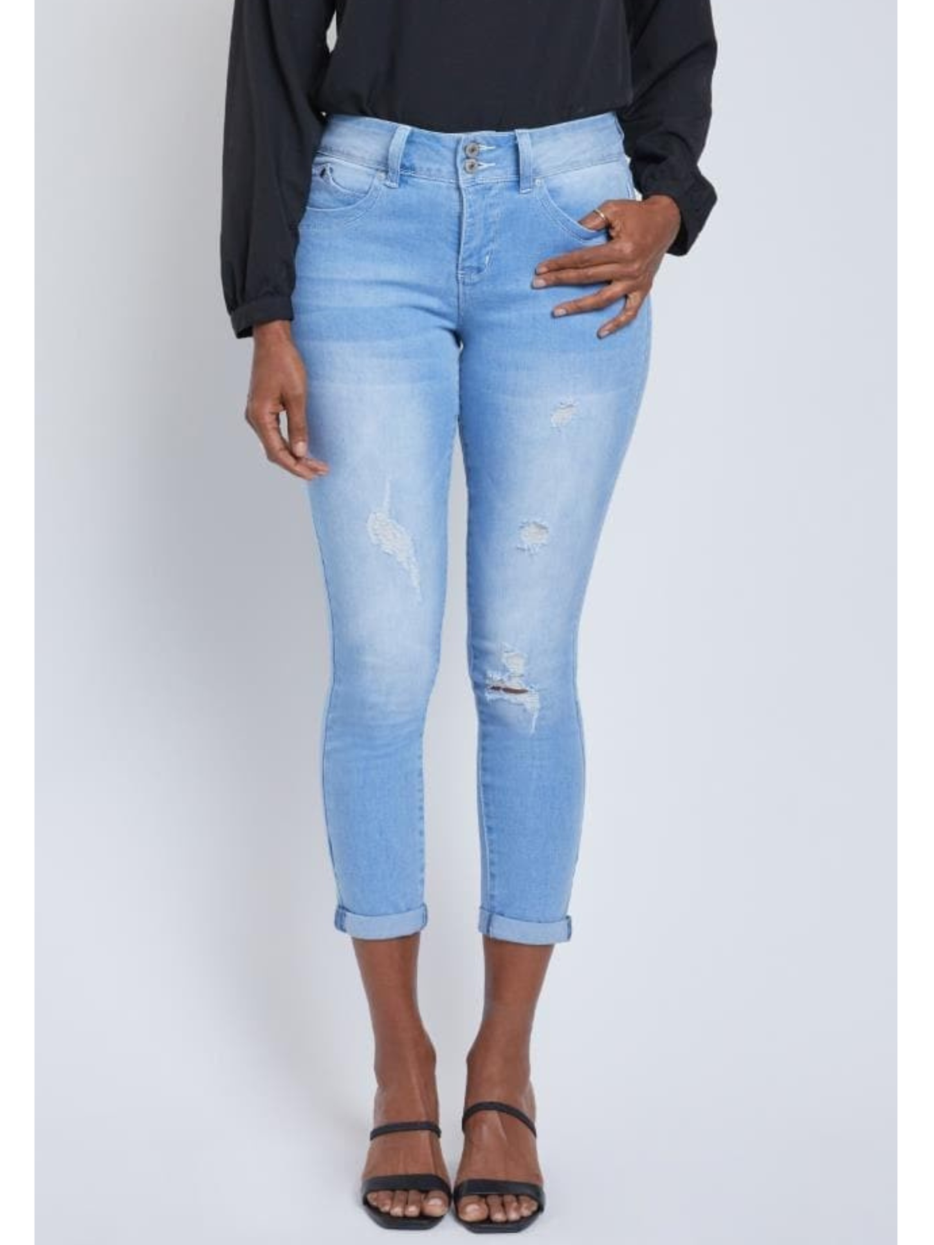 Our famous WannaBettaButt fit! No kidding! This really works. We ever so slightly “lift and shift” your bum to give you a firmer look with specially designed “contour seams” to help you achieve a flattering look. These Women's WannaBettaButt Cuff Ankle Jeans Made are designed with fading throughout for a comfortable and casual look. Featuring a classic five-pocket construction, adjustable cuffs, two button closure with front zip, and belt loops.