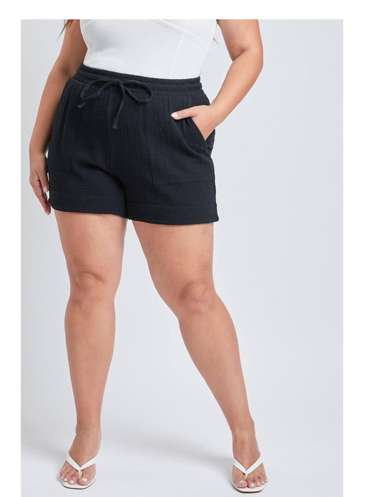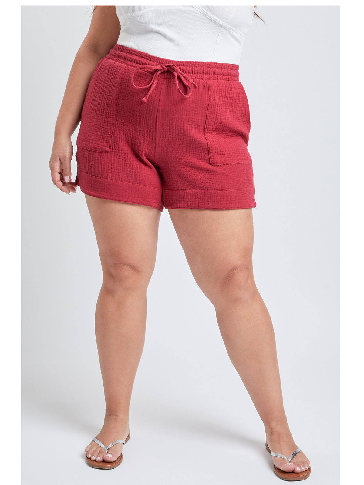 Our Junior's Plus Size Double Gauze Shorts With Banded Hem and Porkchop Pockets are sure to be a summer staple. These super comfy shorts are perfect for the beach or your next vacation! Featuring drawstring waistband, banded hem, lightweight double gauze cotton fabric, and porkchop pockets.
