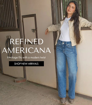 Woman wearing a beige jacket and blue jeans standing in front of a wooden door.Collection Link